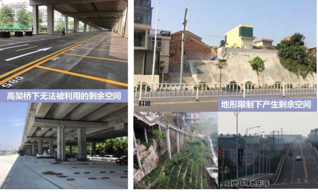 建筑物間的不規(guī)則空間、被污染土地上的剩余空間、高架橋下無(wú)法被利用的剩余空間、地形限制下產(chǎn)生的剩余空間、原有用途改變后被廢棄的空間。