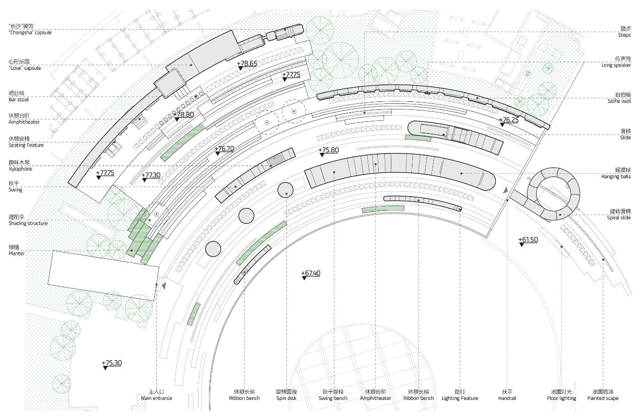 該屋頂更新改造項(xiàng)目,旨在創(chuàng)造一個(gè)時(shí)尚潮酷的戶外社交互動(dòng)中心,作為可以欣賞湘江美景的人氣聚集點(diǎn)和休閑空間,面向前來(lái)開(kāi)福區(qū)長(zhǎng)沙大悅城游玩和消費(fèi)的年輕人和家庭使用。